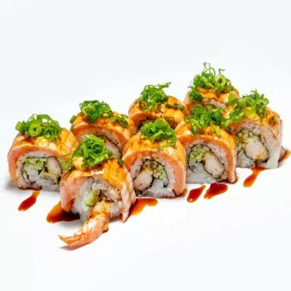 Grilled salmon, spicy sauce, green onion, cucmber, tempura shrimp, unagi sauce.