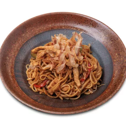 Локшина якісоба, смажена з куркою та овочами в соєвому соусі або в білому вершковому соусі на вибір. Подається з водорослями Кізамі-норі та стружкою тунця Боніто.