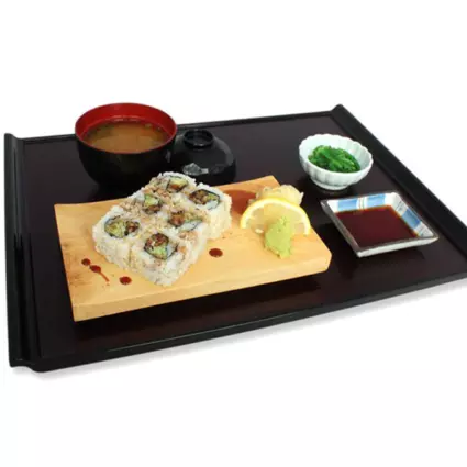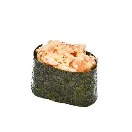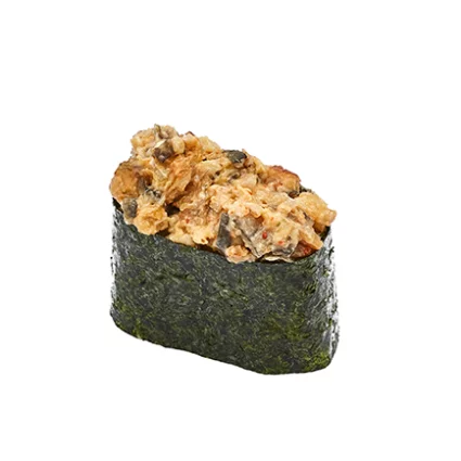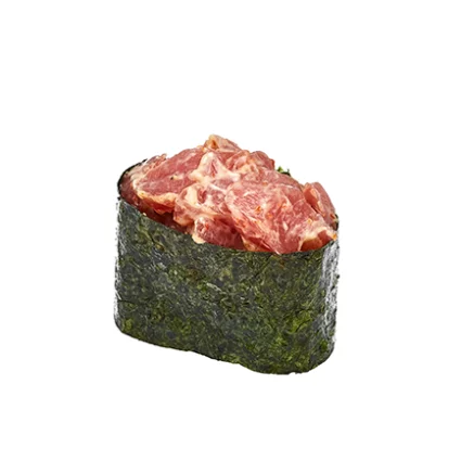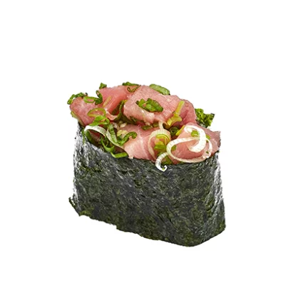 Суші ґункан з делікатесного черевця блакитного тунця Bluefin з гострим соусом спайсі. Подається з білим маринованим імбирем Гарі та японським васабі Кіндзірусі.