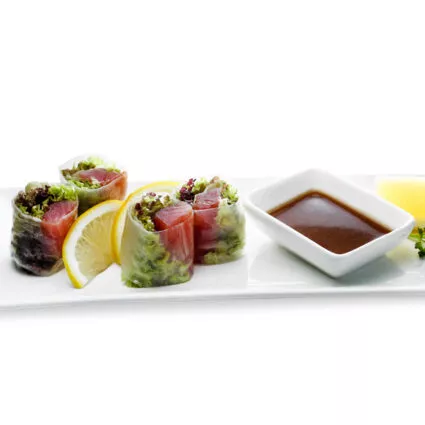 Рулетики з ніжного рисового тіста з маринованим тунцем та листям салату; подаються з кунжутним дресінгом.
