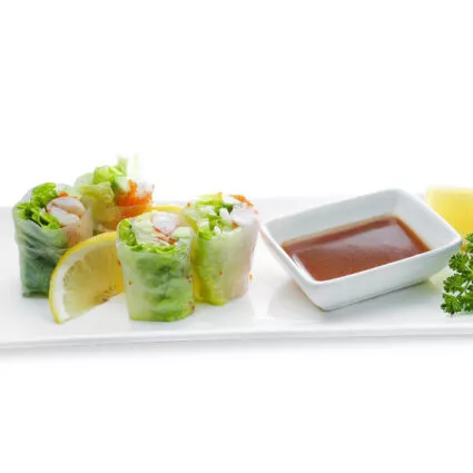 Рулетики з ніжного рисового тіста з тигровими креветками, ікрою тобіко, листям салата, огірком та авокадо; подаються з кунжутним дресингом.